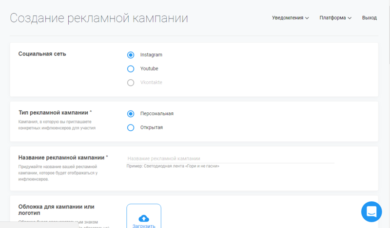 - Выбираете платформу, на которой будет выставлена реклама- instagram или YouTube.