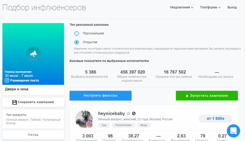 Можно указать тип аккаунта, репозицию, количество необходимых подписчиков, возраст и пол самого инфлюдера. Эти данные помогут вам выбрать наиболее качественного исполнителя, чтобы ваша реклама была как можно более эффективной.