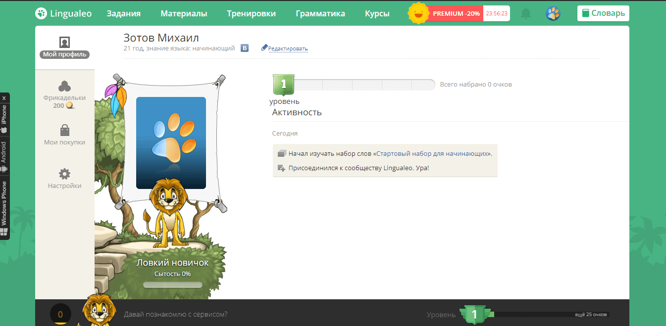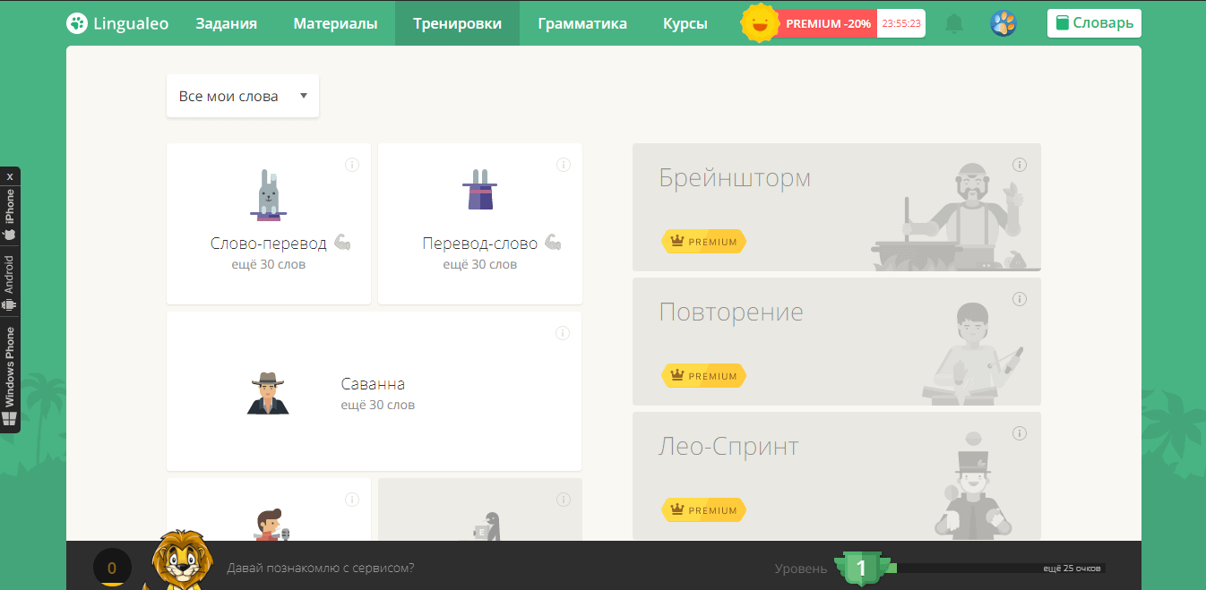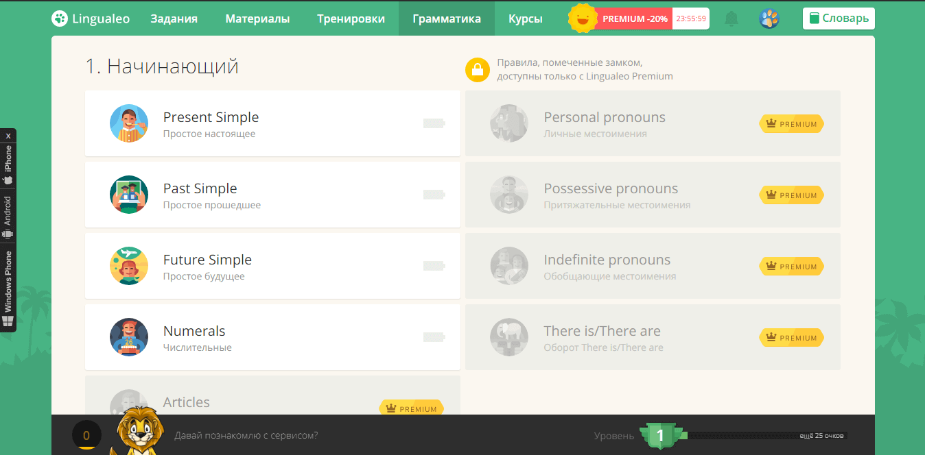 Познавать язык Lingualeo предлагает по базовым грамматическим курсам, видео-урокам, тренингам для улучшения словарного запаса.