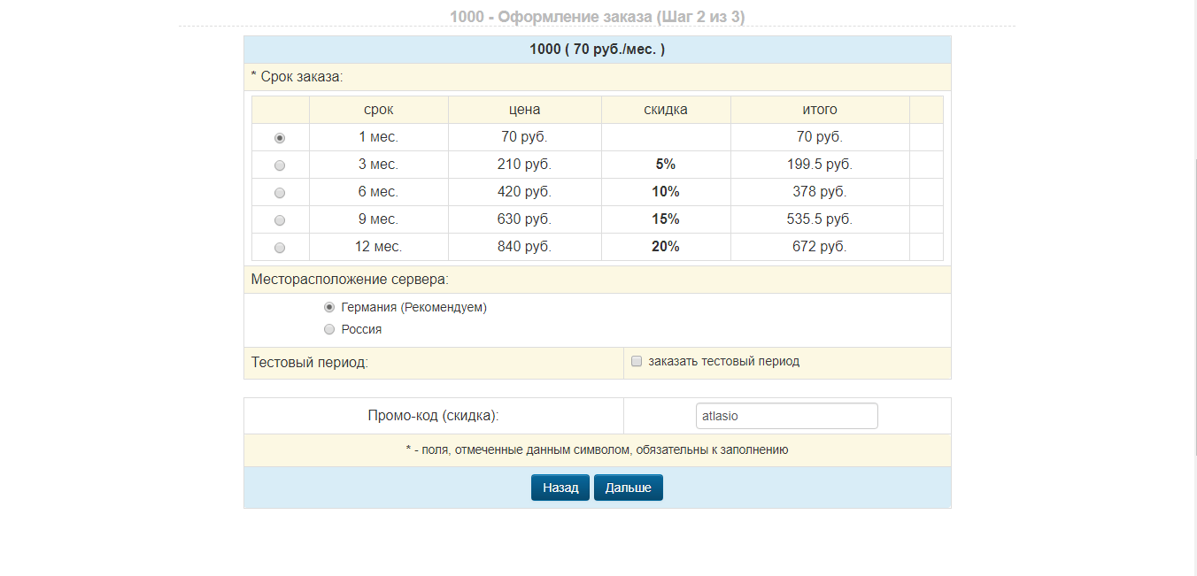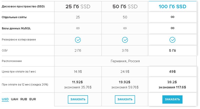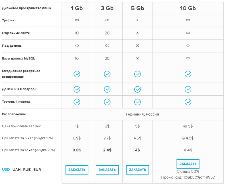 Виртуальный хостинг обойдется от 1 до 5 долларов в месяц, в зависимости от технических характеристик для предоставляемой услуги. Оформляя подписку сразу на полгода либо год, пользователю предоставляется скидка. На каждый из тарифных планов распространяется без лимитного трафика, без лимитного количества под-доменов и создание резервных копий.
