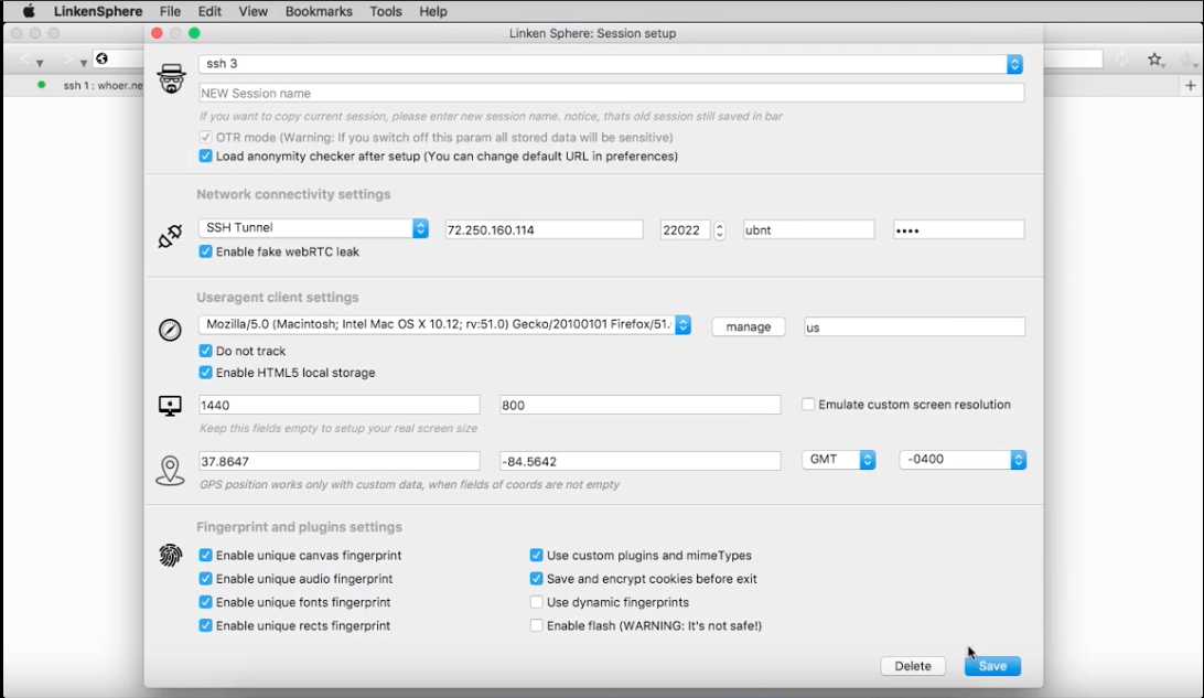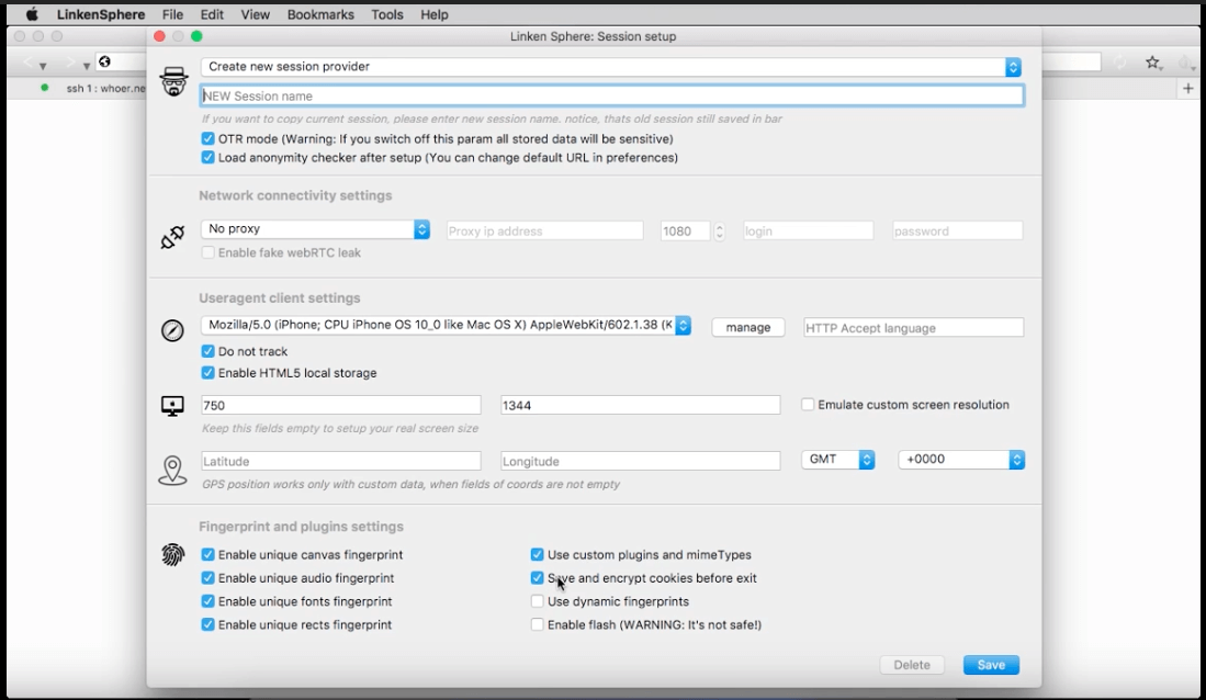 Каждая сессия имеет персональные настройки юзерагента, времени, системного языка, разрешения экрана и настройки геопозиции.
