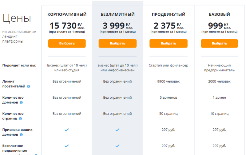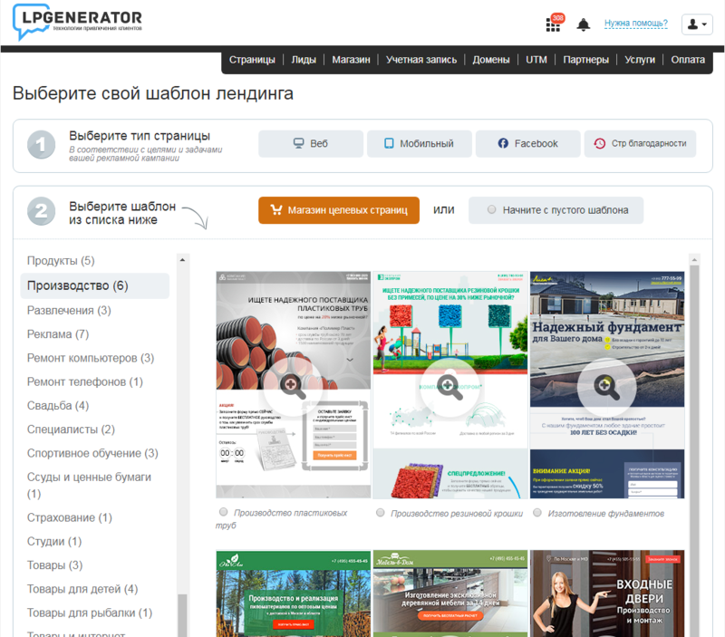 Предусмотрены шаблоны для различных типов страниц: веб, мобильный, фан-страницы Facebook и страница благодарности. Есть магазин готовых целевых страниц, там их около 500 и все они разбиты по темам и направлениям, так же есть возможность начать с пустого шаблона и настроить все самостоятельно, в том числе и импортировать готовый шаблон. Позволяется и править код HTML/CSS.