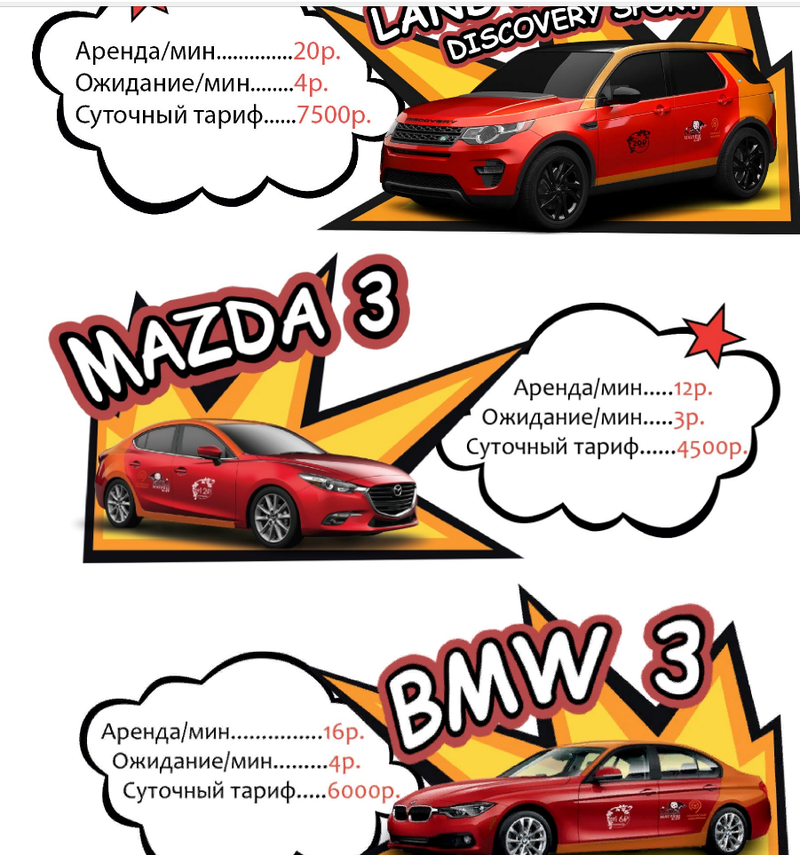 - «Мазда» - поминутный прокат 12 рублей, ожидание 3 рубля, аренда на сутки 4500р.;