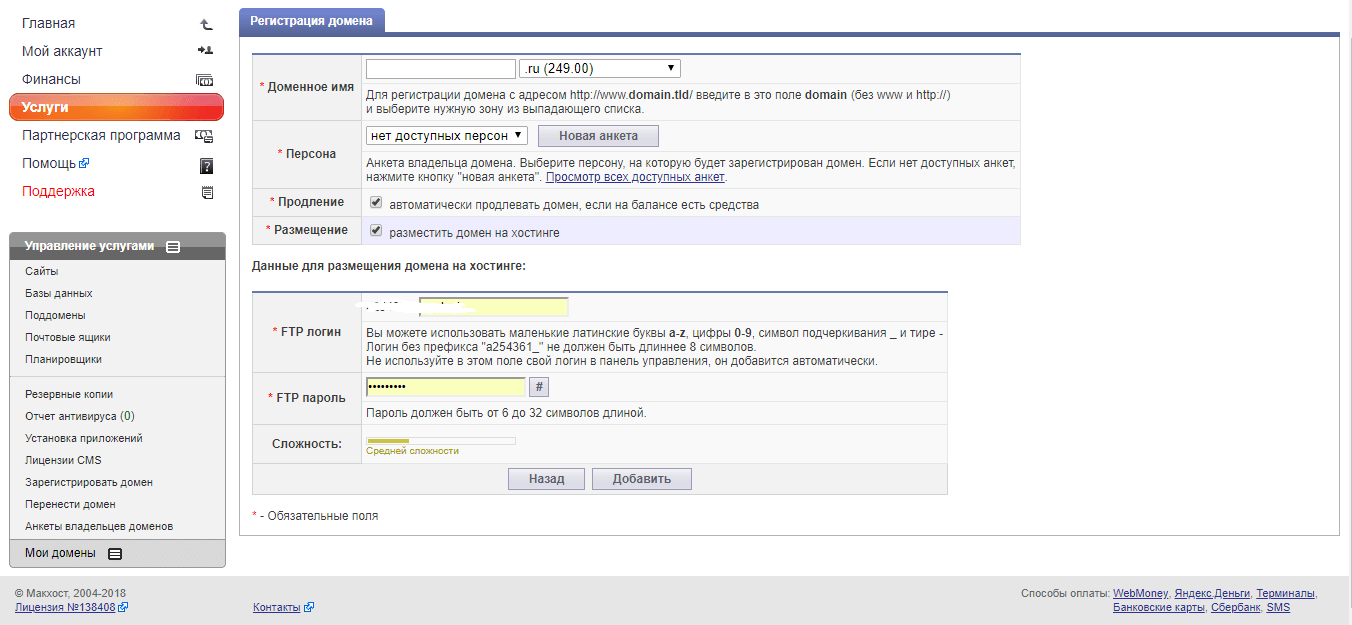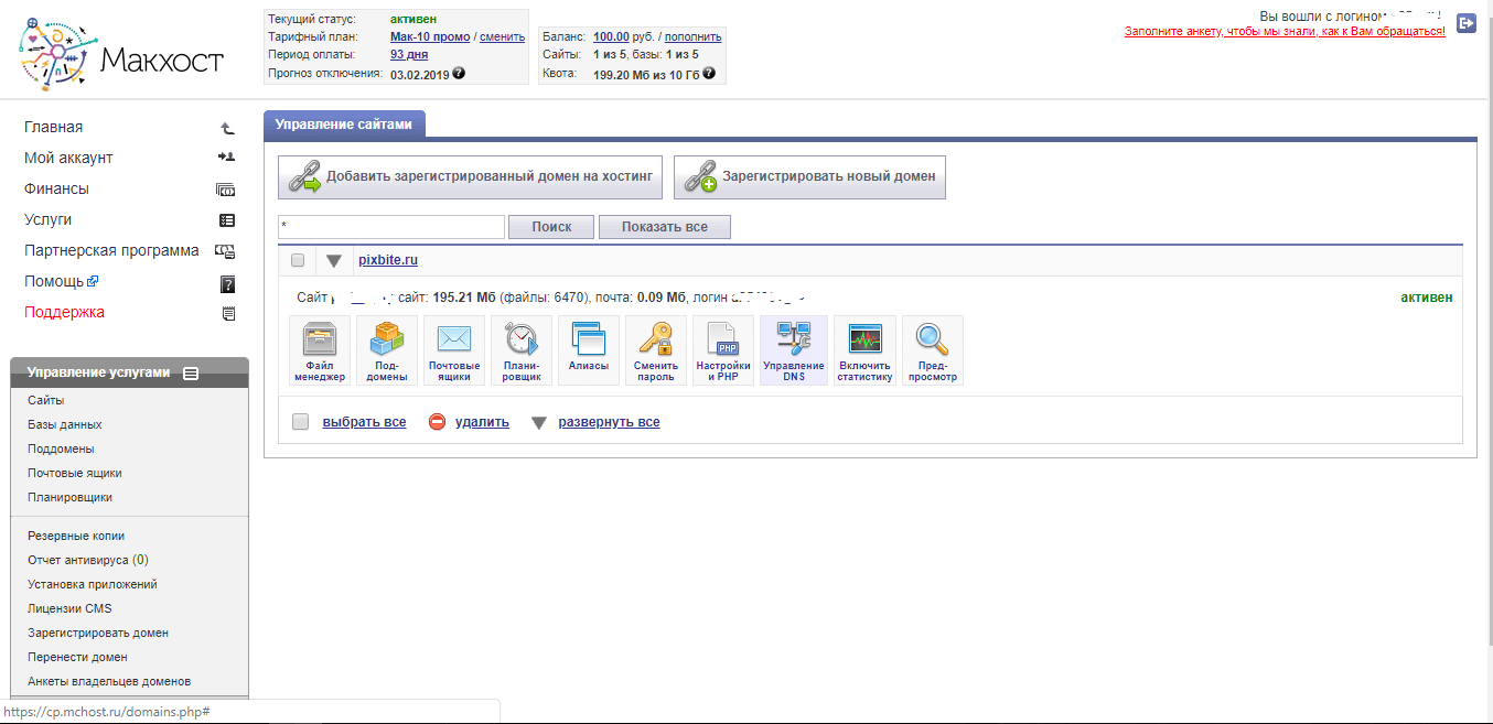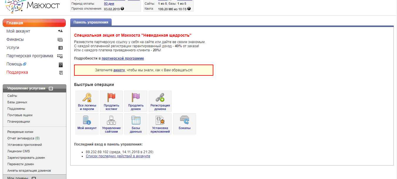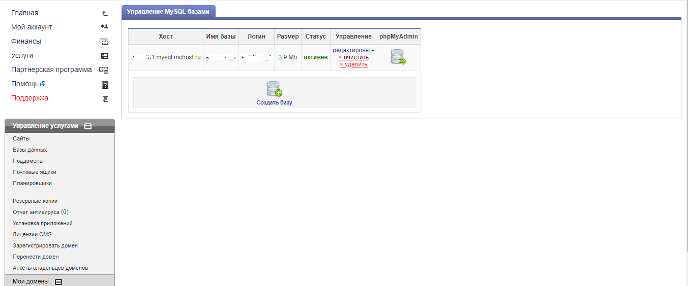 - Панель управления услугами (сайты, базы данных, почтовые ящики, домены и многое другое);