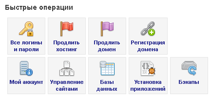 - Панель быстрых операций (база всех логинов и паролей, продление хостинга/домена, БД, управление ресурсами, установка ПО, система бекапов);