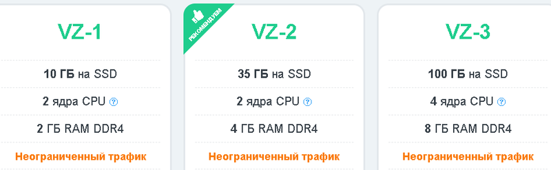 - VZ-1 – 999 р/месяц, 10 гигабайт, работа на двух-ядерном процессоре и 2 гигабайтах ОЗУ;