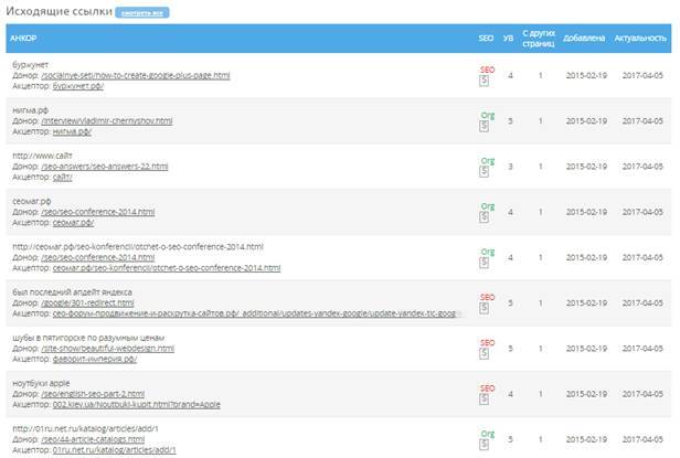 - «Исходящие ссылки» находит все исходящие с внутренних страниц сайта ссылки и выдает информацию о их виде, количестве, расположении, доноре, акцепторе и дате размещения. Эти данные могут помочь вам анализировать и контролировать количество и качество исходящих ссылок.