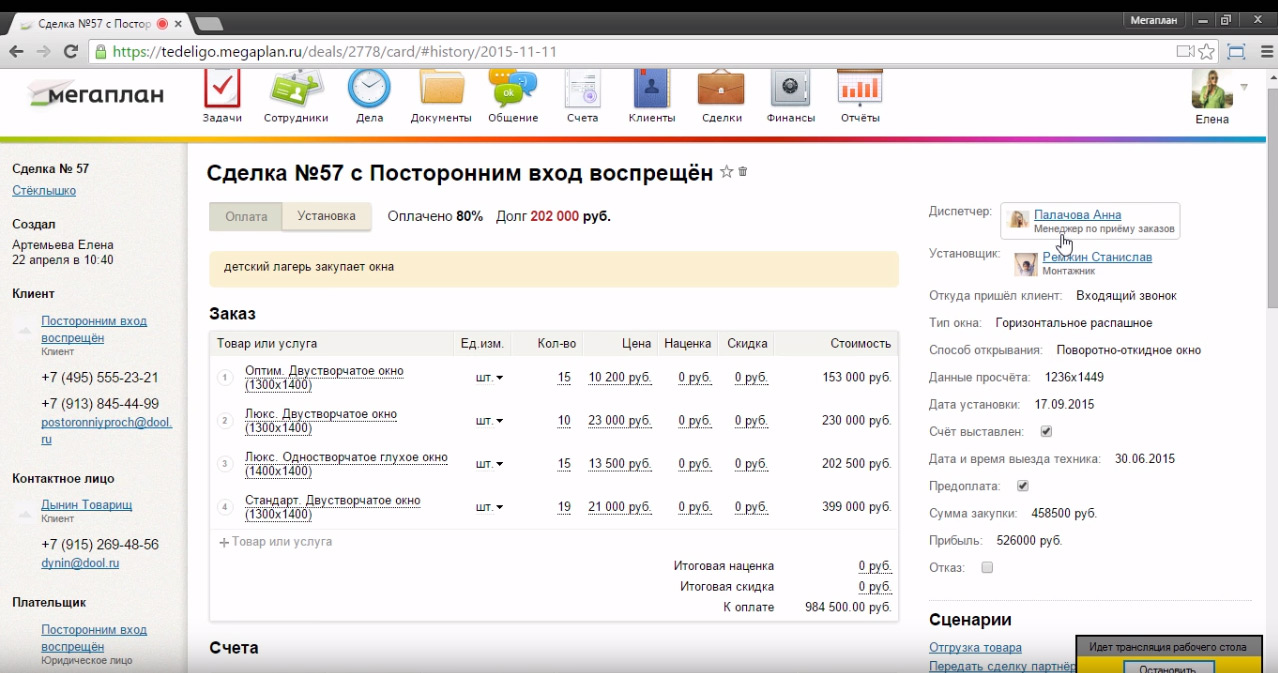 Схему создания сделки можно настроить самостоятельно. Их может быть разное количество, все зависит от специфики вашего предприятия и ваших предпочтений. Удобство Мегаплан заключается в том, что несколько схем можно использовать в рамках одной системы. Руководитель также в праве настраивать последовательность этапов сделки, и сотрудник сможет выполнять этапы работы только в установленной руководителем порядке, перепрыгивать к последующим не удастся.
