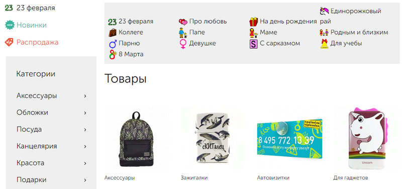 Следует отметить, что хозяева уделили особое внимание не только оформлению своего сервиса, но также и всевозможным техническим моментам. Вся продукция сортируется не только по категориям видов товаров, но также и по тематике, новинкам и акционным датам.