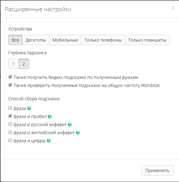 - Глубина парсинга фраз, если выбрать цифру 2то сбор будет вестись максимально глубоко.