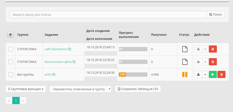 Длительность процесса может занимать длительное время, чем больше будет обьем полученных фраз, тем дольше будет их поиск. Для каждого вашего запроса будет создано отдельное задание, поэтому результаты могут занять несколько страниц сайта и для простоты навигации рекомендуется разделять их на группы.