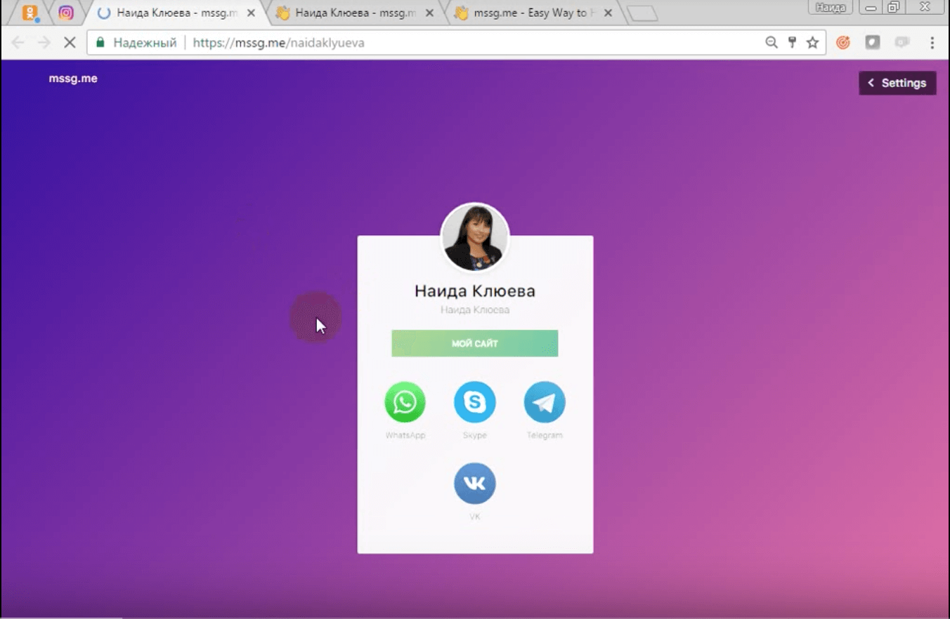 Для ведения бизнеса был создан сервис mssg.me, чтобы потенциальный покупатель без особых усердий мог различными путями связаться с вами в том приложении, в котором ему будет наиболее комфортно. Это будет очень удобно для предпринимательства в Instagram, где с аккаунта фирмы нельзя копировать контактный номер. Данный сервис может помочь вашим клиентам, друзьям или коллегам без труда связаться с вами в интернете. Сайт позволит создать короткий адрес, на котором пользователи найдут все ваши аккаунты в социальных сетях.