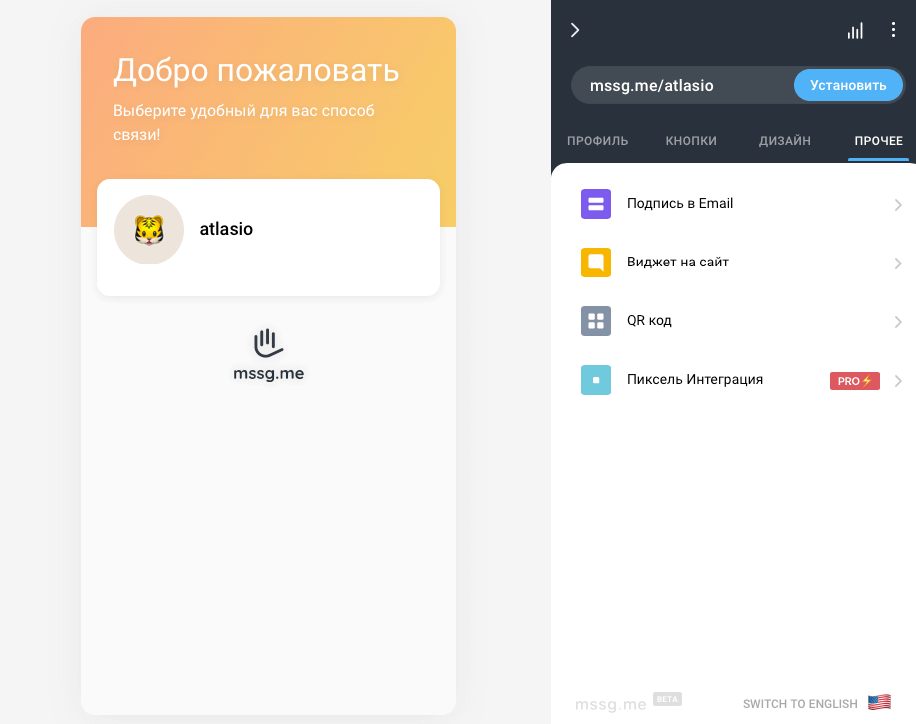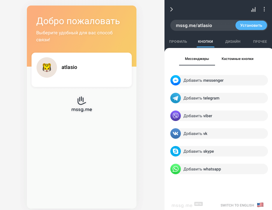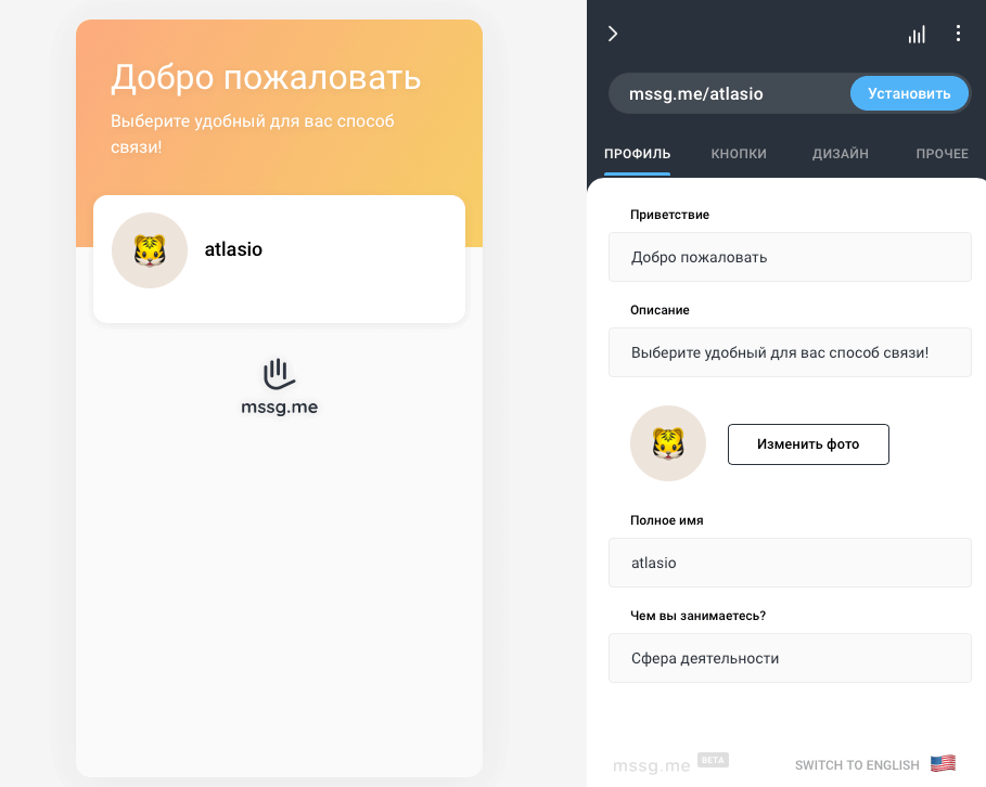 Чтобы воспользоваться услугами mssg.me, нужно зарегистрироваться на сайте сервиса. Дальше вам понадобится описать ваш профиль, придумать адрес вида URL и привязать к нему все свои мессенджеры или страницы в социальных сетях. Созданная страница будет являться вашей персональной визиткой, которая хорошо отображается не только в декстопных версиях браузера, а также отлично оптимизирована под мобильные устройства.