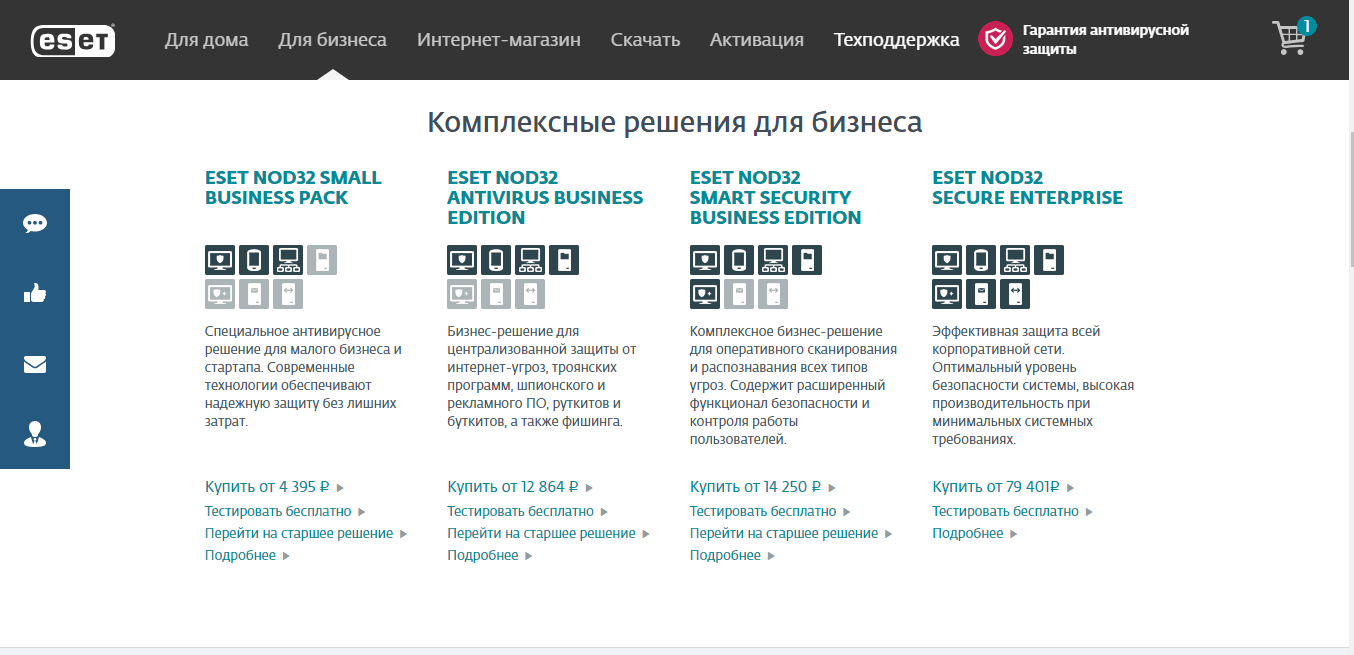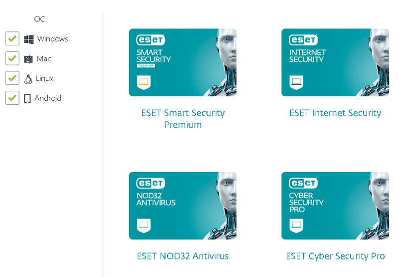 - «ESET NOD32 Smart Security Family» – комплексный пакет для защиты нескольких устройств. Данный защитный комплекс будет оптимальным для семейной эксплуатации, обеспечивает защиту нескольких устройств, таких как ПК, смартфоны, планшеты, Смарт-ТВ, приставки. При смене устройства, доступна функция бесплатной переустановки антивирусного ПО на новый гаджет. Имеется дополнительное мобильное приложение для детской защиты с родительским контролем. Смарт телевизоры, игровые приставки, работающие через сеть всемирной паутины, также подвержены вирусной угрозе, NOD32 предлагает качественное и надежное решение этой проблемы. Стоимость лицензии составляет 1990 рублей;