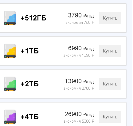 - Дополнительные 512Гб – 3790 рублей в год;