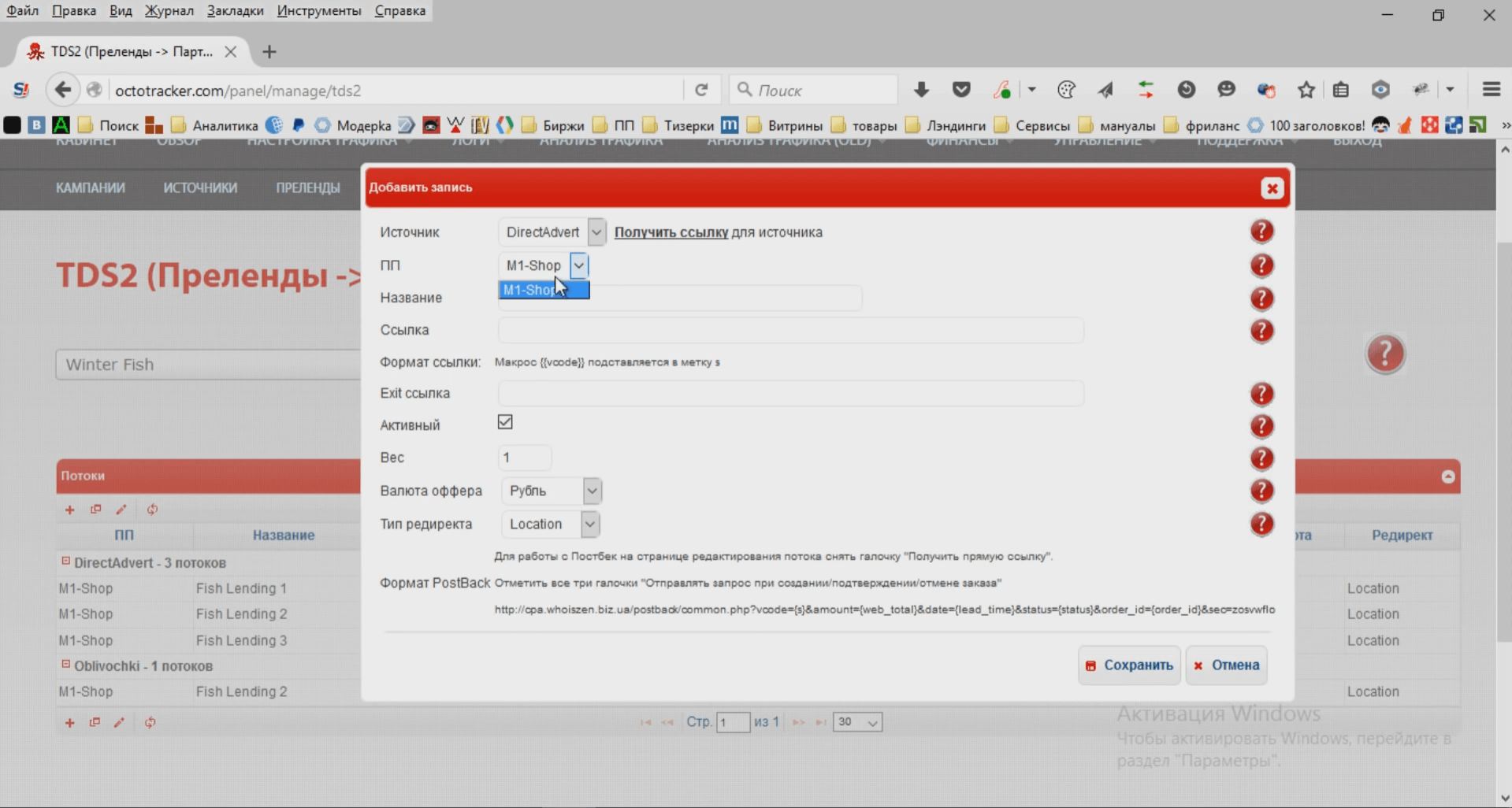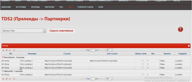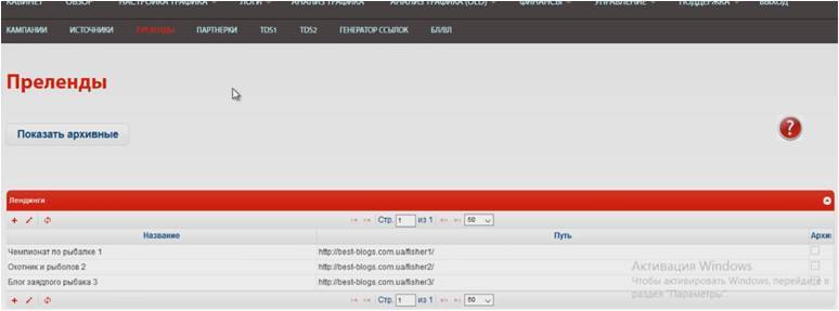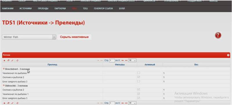 Одна из них отвечает за преленды, здесь определяется распределение трафика между прелендами и настраиваются параметры ротации. Вторая ТДС отвечает за партнерские программы, и тут добавляются ленденги.