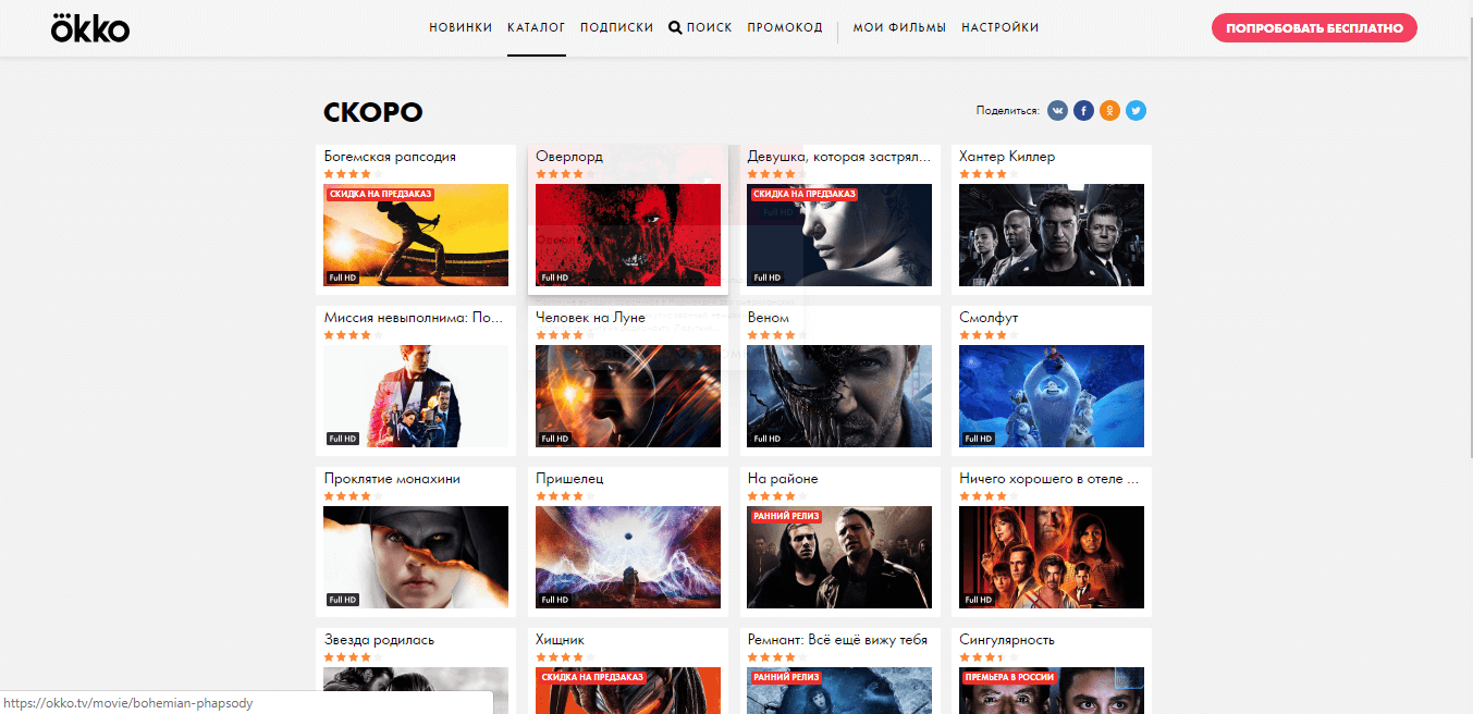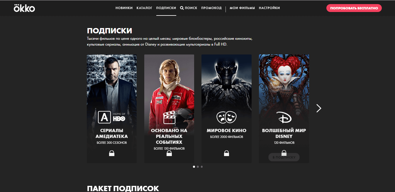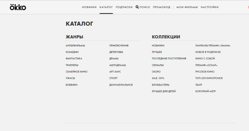 Стоит отметить, что в каталоге сайта все фильмы поделены на жанры. Также вы там увидите коллекции, где вас ждут подборки фильмов по определенным критериям, сборник которых создали работники Okko.