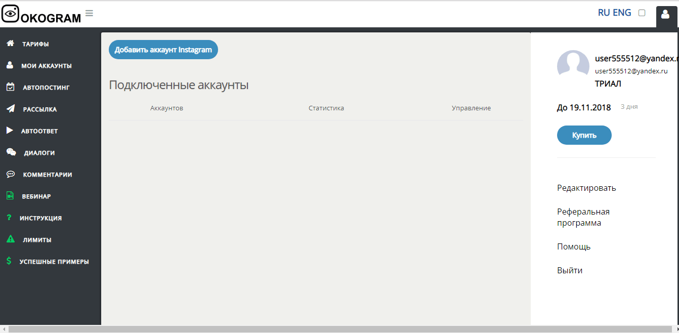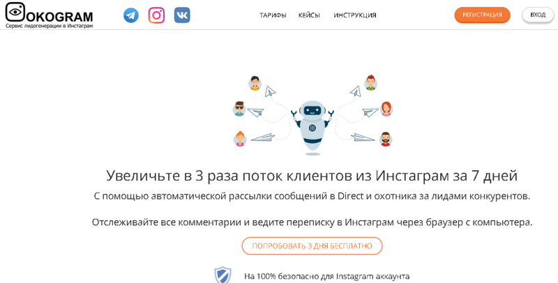 Платформа «Okogram» предназначена для увеличения популярности профилей в социальной сети «Инстаграм». Сервис производит рассылку сообщений в «Директы», а также отлавливает лиды возможных конкурентов. Платформа достаточно юная, функционирует всего на протяжении двух лет, однако уже успела обрести высокую популярность. Для новых пользователей, сайт предлагает бесплатную, пробную демо-подписку, за время которой, пользователь имеет возможность протестировать ресурс и все его возможности. Также на сайте имеется интерактивный онлайн чат, в котором всегда имеется консультант готовый в любой момент оказать помощь клиентам.