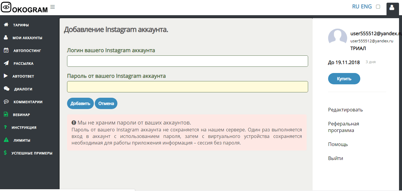 Как утверждают разработчики, что неданный момент и не опровергается пользователями, за все время функционирования сервиса, не произошло ни одной блокировки аккаунтов, сотрудничающих с «Окограм».