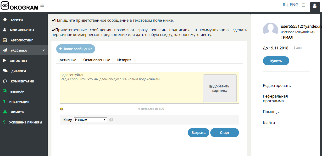 - Рассылка приветствующих сообщений – система отправляет новым подписчикам профиля, благодарные и приветствующие сообщения, налаживая тем самым диалог, и привлекая потенциальных клиентов.