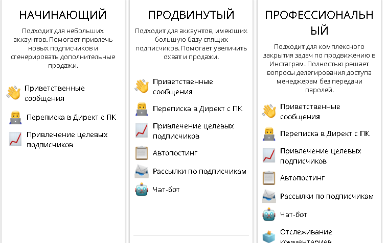 Сервис предлагает три основных тарифных плана на подписку (профессиональный, продвинутый и для новичков), каждый из которых обладает рядом определенных возможностей: