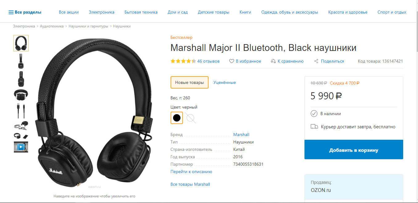 Каждый товар в магазине имеет своё краткое описание: цену, бренд, тип товара, год выпуска, подборные характеристики. Если пролистать страницу вниз, то можно почитать или оставить отзывы. Под ценой товара будут показаны наличие товара в магазине и примерные сроки доставки. Здесь же добавляем его в корзину, если же нужный товар отсутствует, то можно включить уведомление: когда товар появится в продаже вам, об этом оповестят по почте.