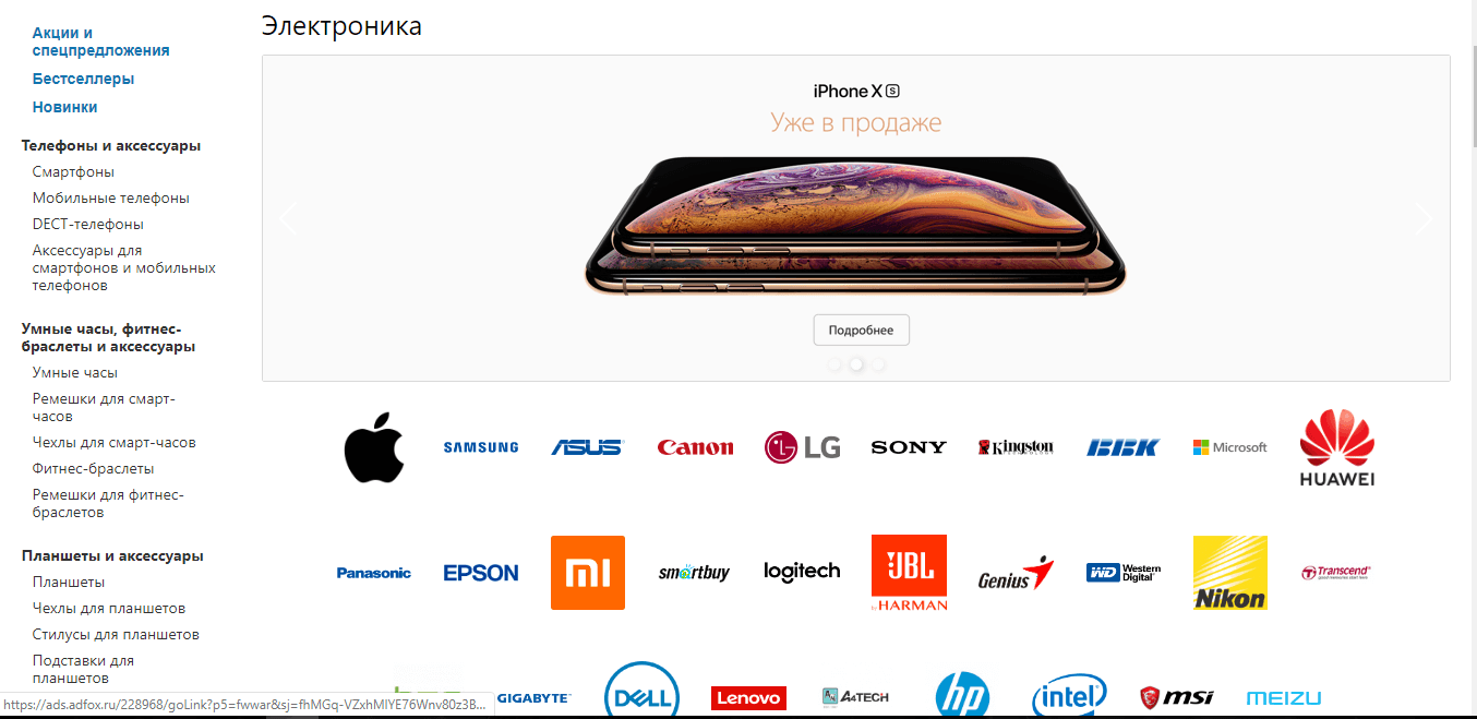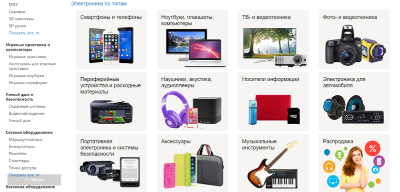 В этой категории товары тоже отсортированы на разделы, купить можно любую электронную технику на свой вкус: телефоны, принтеры, наушники, телевизоры и т.п.
