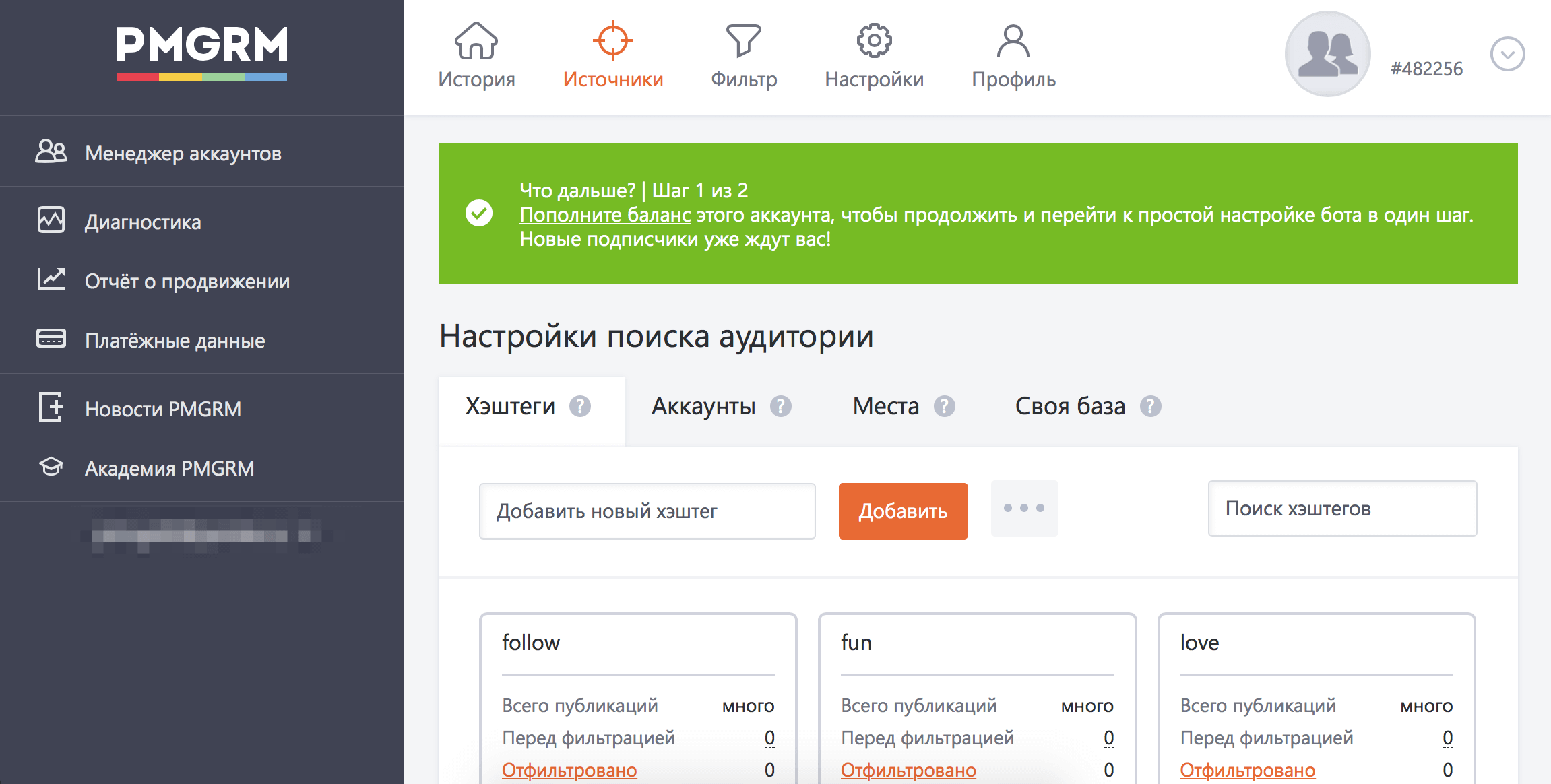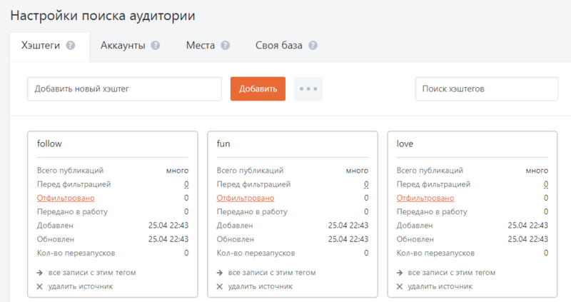 Для начала нужно будет выбрать источники, откуда сервис будет искать пользователей.