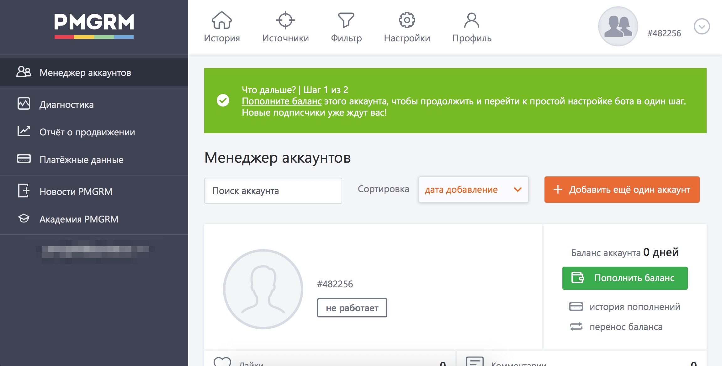 Далее вы попадаете в менеджер аккаунтов, где вам нужно добавить профиль intagram, который вы собираетесь продвигать. Также не забываем пополнить баланс, без этого сервис не будет работать.