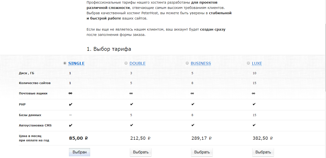 - «100» - стоимость подписки составляет 129 рублей в месяц, пользователю предоставляется по 10 почтовых доменов и сайтов, 4 гигабайта выделенного пространства на диске, 16 процессов;