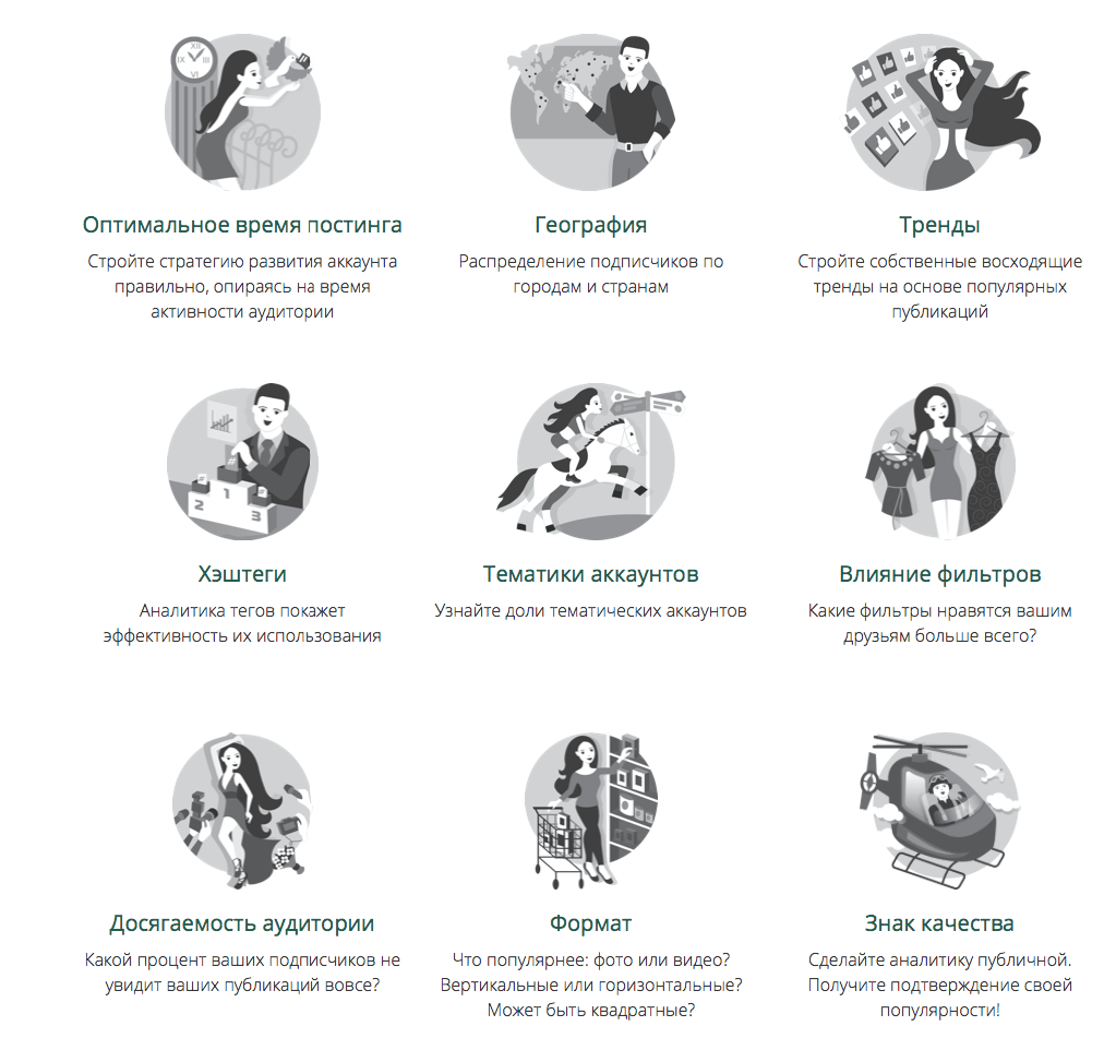 Этот сервис создан, чтобы помогать получать подробную информацию с аккаунтов Instagram, а также данные о подписчиках вашего профиля. Сервис будет очень полезен для изучения эффективности ведения вашего инстаграма, позволит выявить эффективность ваших действий, направленных на раскрутку вашего аккаунта.