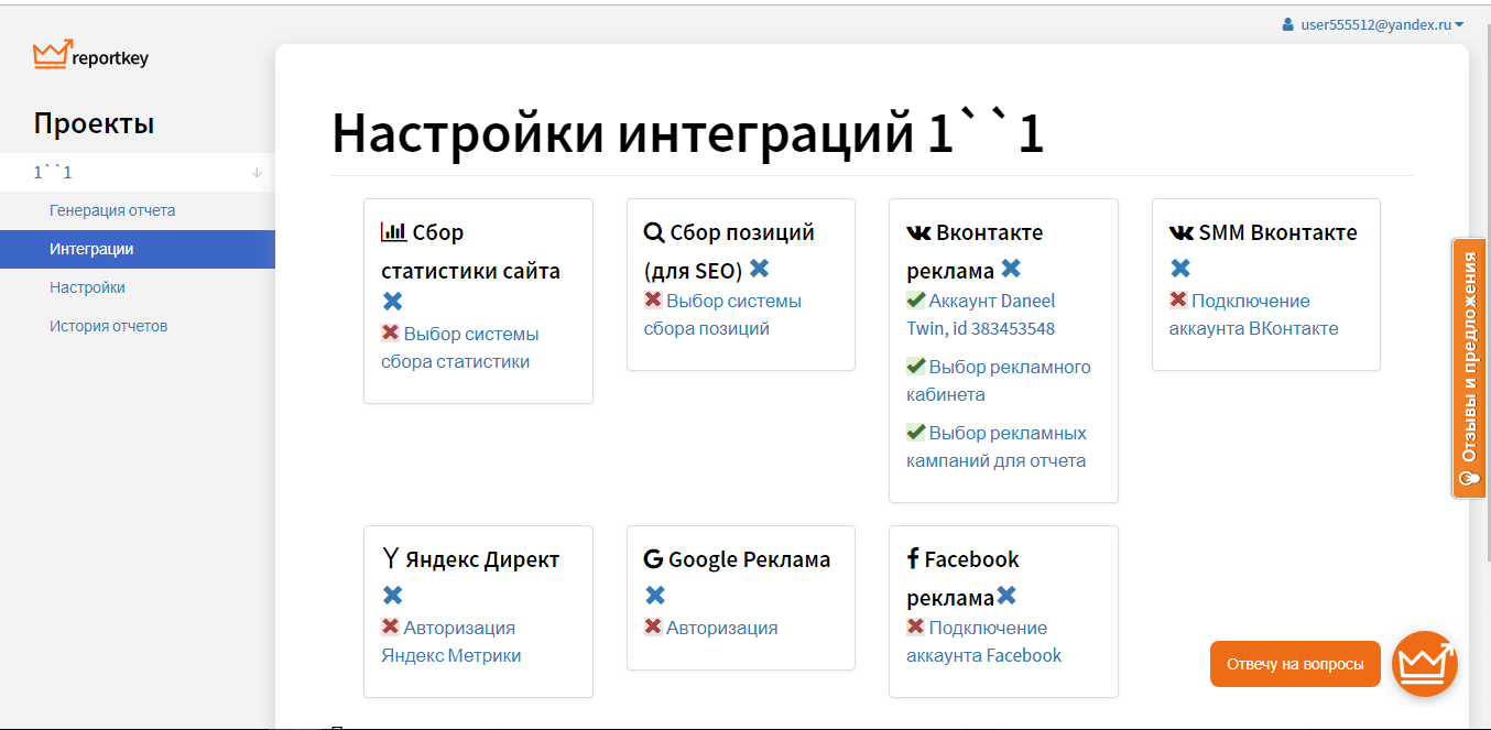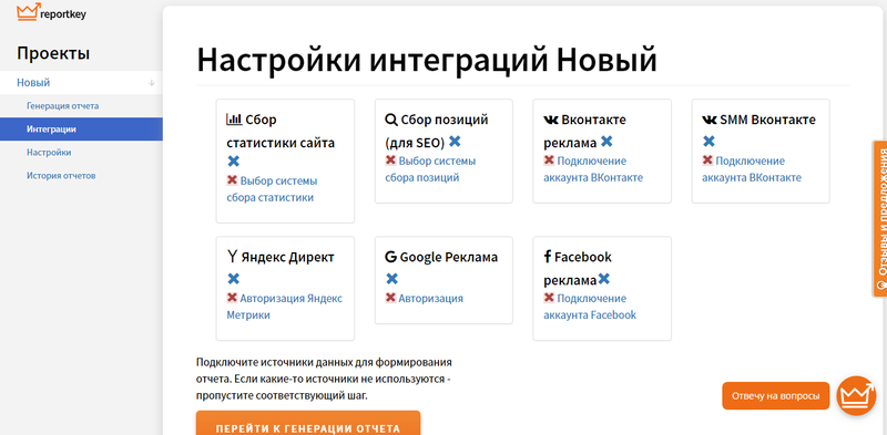 После ввода названия проекта нужно подключить сервисы. Интеграция выполняется в несколько кликов мышкой. Это не займет много времени. Перед этим требуется провести настройку сбора информации в Яндекс.Метрике, Google Analytics или в иных системах. Пользователю ReportKey не требуется уметь программировать и использовать API. Интерфейс сервиса довольно простой, включает в себя только необходимые элементы.