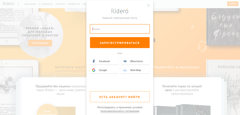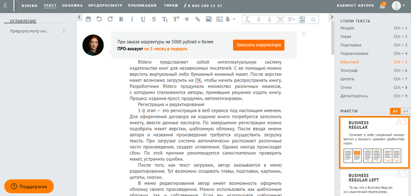 Ridero представляет собой интеллектуальную систему издательства книг для независимых писателей. С ее помощью можно верстать виртуальный либо бумажный книжный макет. После верстки макет возможно загрузить на ПК, чтобы начать распространять книгу. Разработчики Ridero продумали множество различных нюансов, с которыми сталкиваются авторы, принявшие решение издать книгу. Процесс издания прост, продуман, автоматизирован.