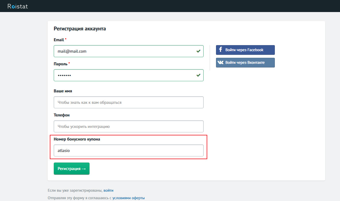 Бонусный купон Roistat