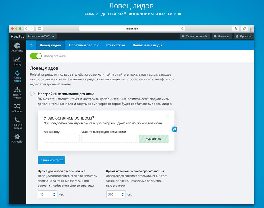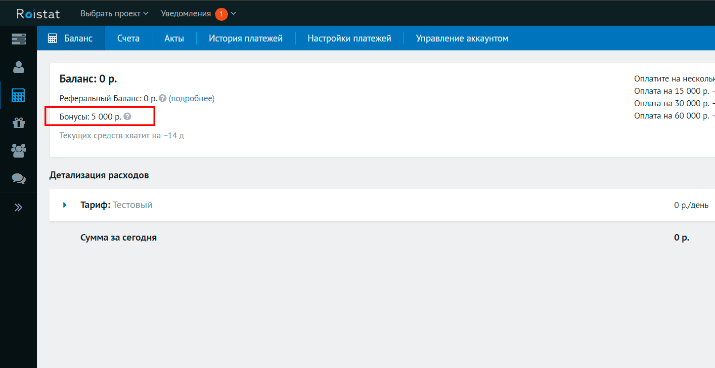 Используйте бонусный купон "first" при регистрации и получите 5000 рублей на баланс вашего аккаунта Roistat.