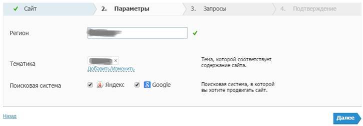 - Указать параметры сайта: регион, тематика и поисковая система (Яндекс и/или Google), в которой планируется продвижение.