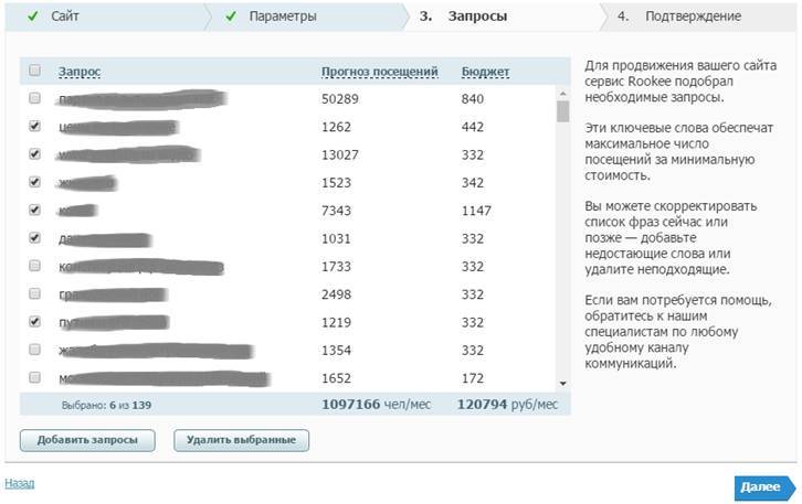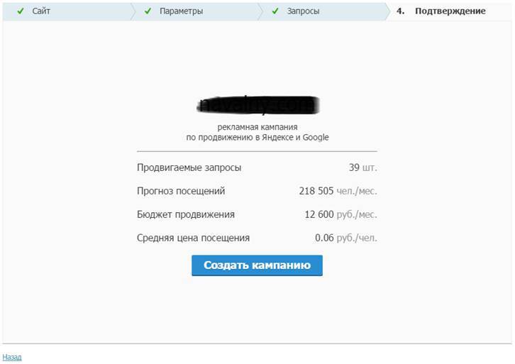 - Подтверждение полученных данных: количество запросов, прогноз посещения и бюджета. Всегда можно вернуться назад и внести изменения.