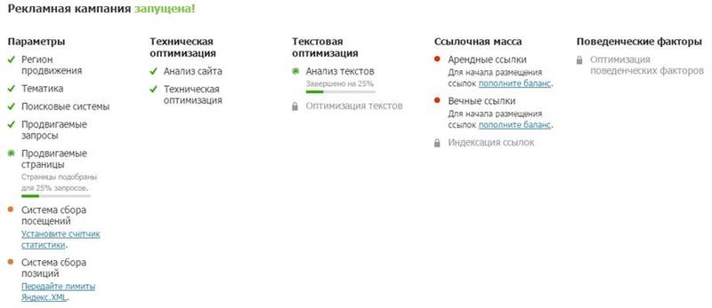 После создания рекламной кампании система начинает работу: подбирает страницы по выбранным вами запросам для продвижения и анализирует тексты.