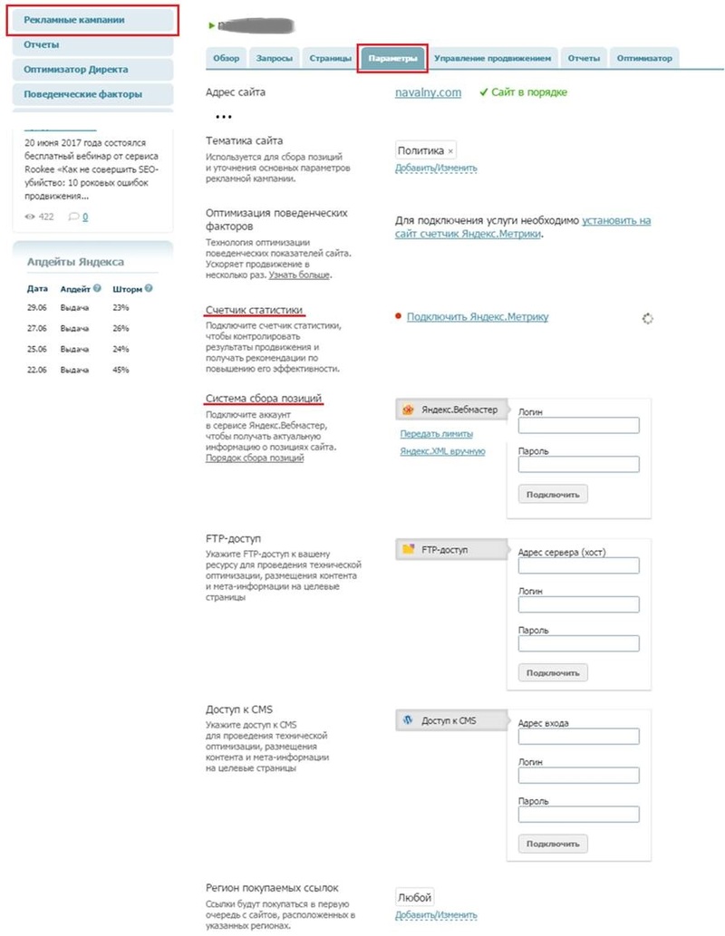 Предлагается подключить счетчик статистики, что позволит контролировать результаты продвижения и получать рекомендации по повышению его эффективности, и аккаунт в Яндекс.Вебмастер, чтобы получать актуальную информацию о позициях сайта. Сделать это можно во вкладке «Параметры».
