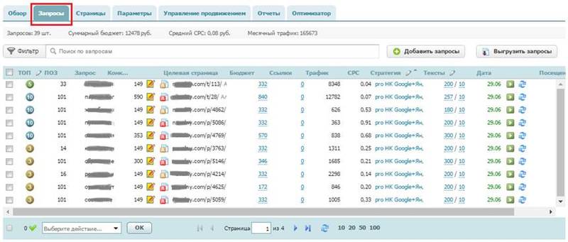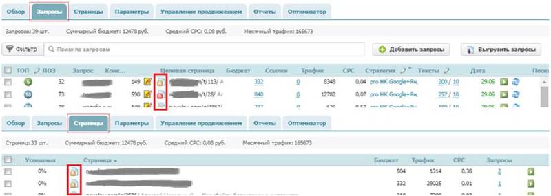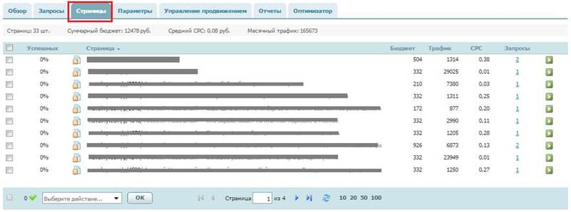 В «Страницы» список всех целевых страниц. И каждой странице соответствуют: % запросов с установленным ТОПом, достигших цель; бюджет на месяц; прогнозируемый трафик; прогнозируемая стоимость 1 перехода на страницу из поисковых систем; количество запросов, продвигаемых по данной странице.