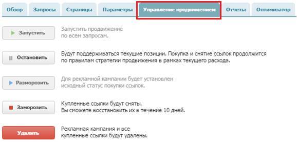 «Управление продвижением». Если его остановить, то будут поддерживаться текущие позиции, и при разморозке покупка ссылок продолжится. При заморозке все купленные ссылки будут сняты.