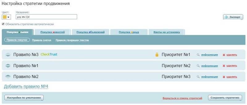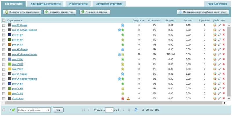 Стратегии – это набор фильтров для отбора доноров для рекламной кампании. Стратегии можно создавать самим или пользоваться стандартными стратегиями Rookee, или вовсе покупать авторские стратегии, среди которых можно найти нацеленные на продвижение новых сайтов, повышение тИЦ и т.д. Среди стандартных стратегий сервиса есть те, которые направлены на продвижение по высокочастотным, среднечастотным и низкочастотным запросам в Яндекс/Google с высоким, средним или низким уровнем конкурентности.