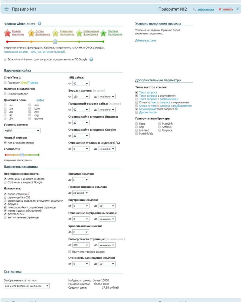 Параметров проверки большое количество, и все они сгруппированы по значимости и распределены по соответствующим уровням:- легкая фильтрация подходит для НЧ НК запросов;