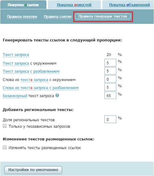 При задании правила генерации текстов ссылок нужно указать процентное соотношение разных анкоров.