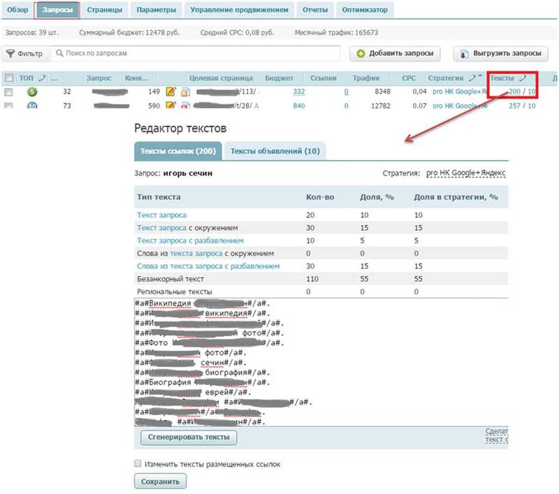 Тексты система создает автоматически на основе запроса. Проследить за созданным текстом можно в таблице запросов, так же тексты запросов можно самостоятельно.