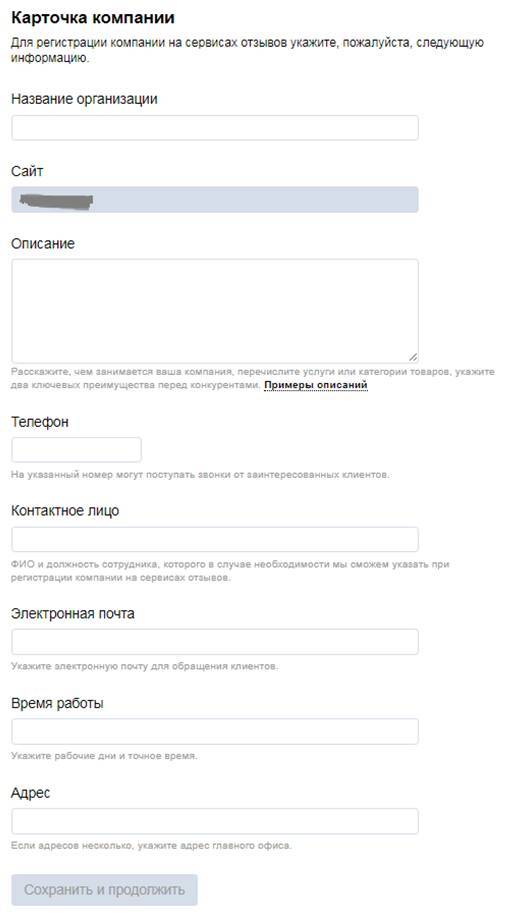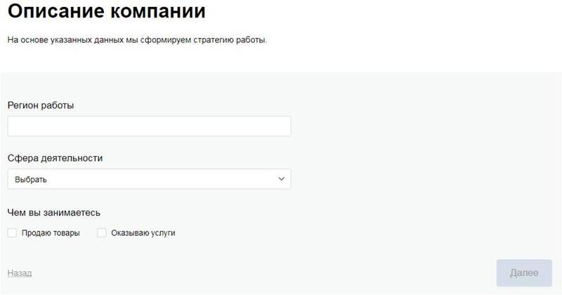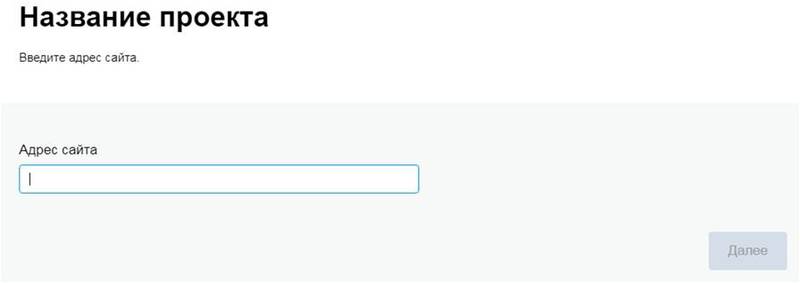 Создание проекта предусматривает ввод адреса сайта описание компании: регион, сфера деятельности и сфера занятости.