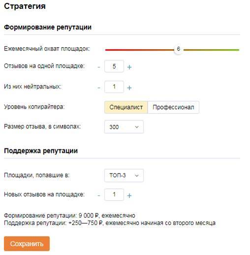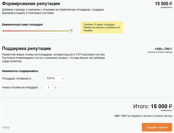 - Стоимость «Поддержки репутации», начиная со второго месяца, зависит от того, какие площадки поддерживаются и сколько новых отзывов на площадке нужно размещать.