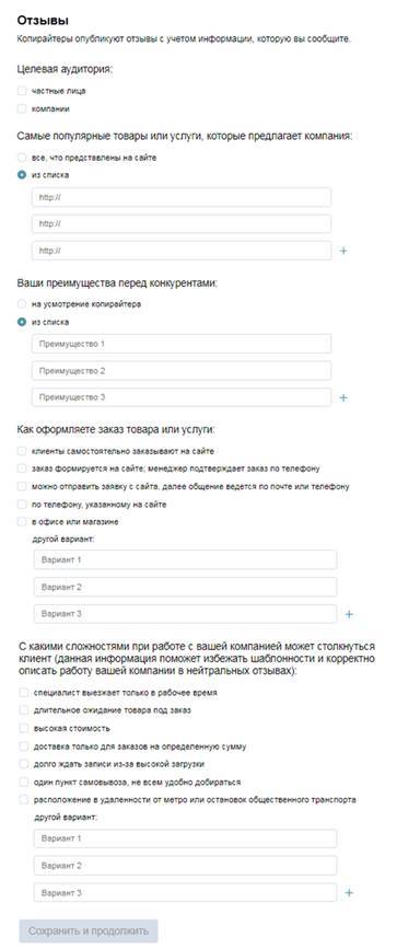 Обозначается целевая аудитория, самые популярные услуги компании, преимущества перед конкурентами, способ оформления заказа, сложности при работе с компанией.