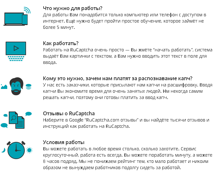 Стать сотрудником сервиса по распознаванию капч достаточно просто, для этого необходимо иметь лишь персональный компьютер, и элементарные навыки пользователя ПК. Основной задачей сотрудника, будет распознавание тех решений, которые не могут быть выполнены в автоматическом режиме. Работник получает оплату на свой счет за каждое выполненное задание, обналичивание средств не облагается каким-либо дополнительным сбором. Минимальная сумма, которую можно снять со своего счета составляет 15 рублей.