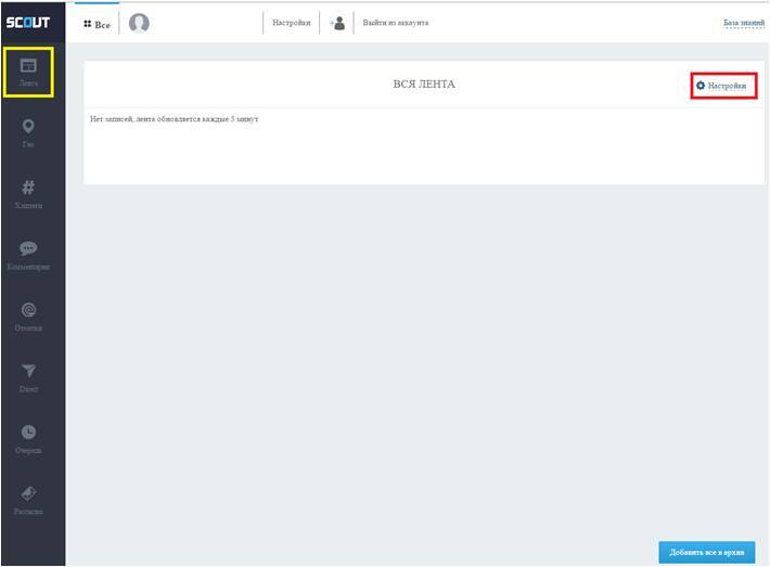 - «Лента». Здесь вы можете просматривать все записи, где будут присутствовать интересующие вас хэштеги (настроить это можно во вкладке «Хэштеги») и гео-точки (можно настроить во вкладке «Гео»). Также в этой вкладке можно настроить оповещений, хэштеги, гео-тэги, шаблон сообщений, изменить или удалить аккаунт.